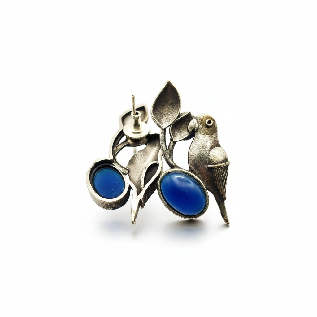 Oxidised parrot earrings with an antique silver finish that develops unique character over time. Handcrafted with intricate detail, these statement pieces blend traditional metalwork with modern style.