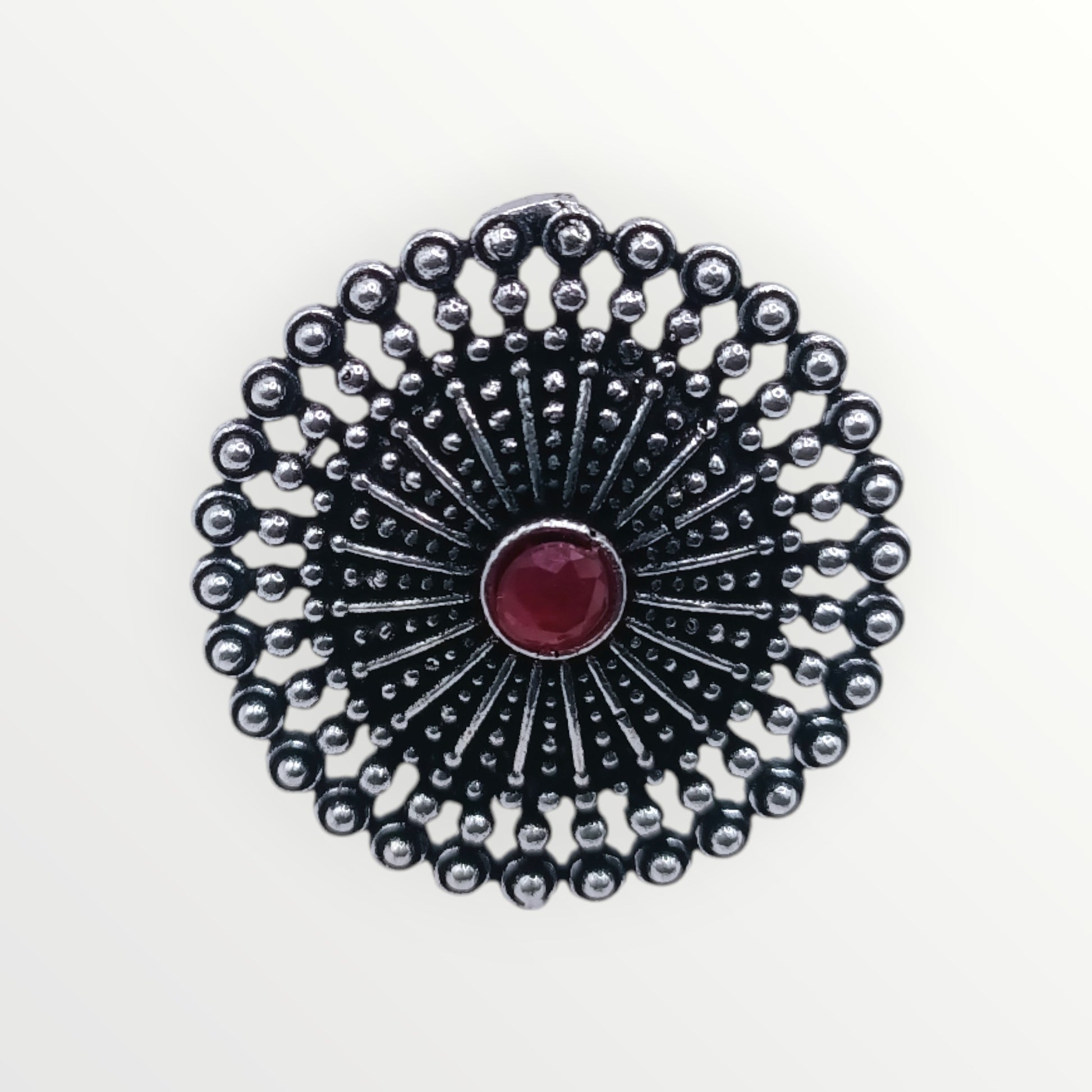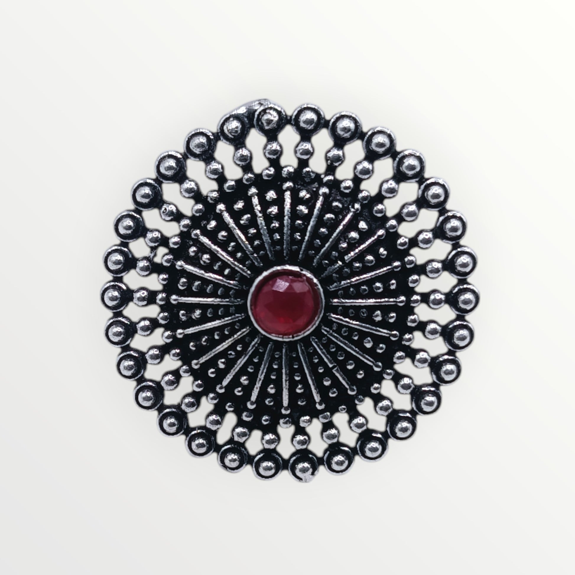 Experience comfort and style with the adjustable fit of our open-ended band ring. Each ring features a majestic sunburst-inspired design, made with premium oxidised metal and adorned with a deep crimson gemstone. Handcrafted with excellence, this ring is truly one-of-a-kind.