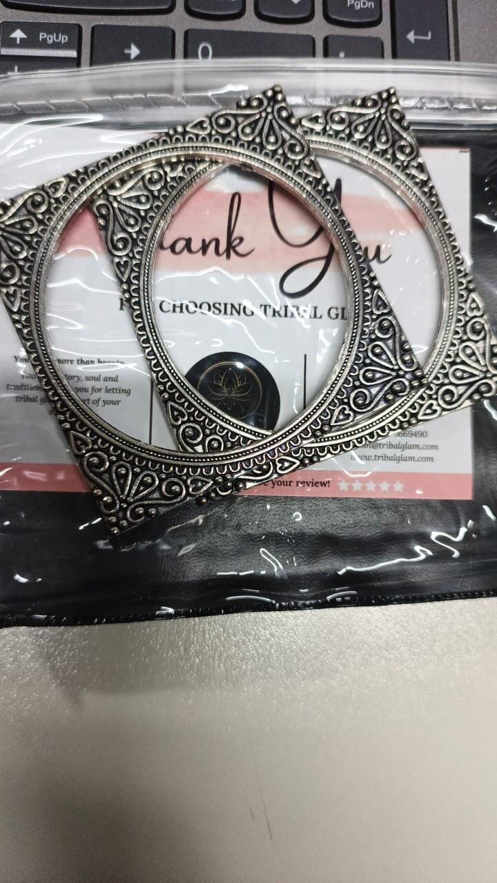 Square oxidised bangles featuring delicate heart and teardrop motifs. These versatile pieces transition seamlessly from festive occasions to everyday wear, offering an authentic cultural aesthetic with contemporary appeal. Designed for medium wrists with a secure, comfortable fit. Maintain the antique finish by keeping away from water and chemicals, and store separately to prevent damage.