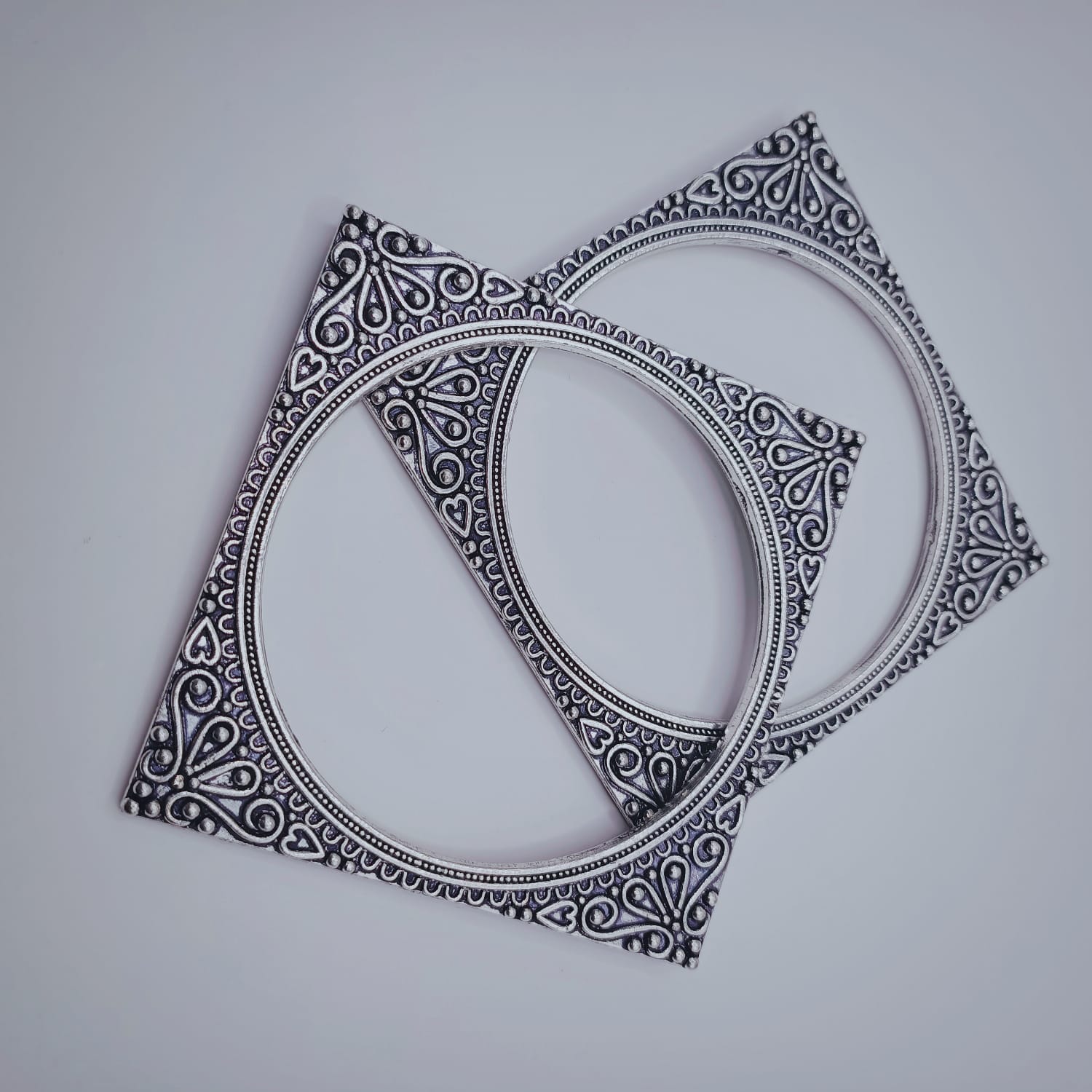 Square oxidised bangles with intricate heart and teardrop patterns, perfect for a timeless look. Ideal for festive wear, weddings, or pairing with modern outfits. A unique blend of cultural heritage and modern style, with a secure, elegant fit for medium wrists.