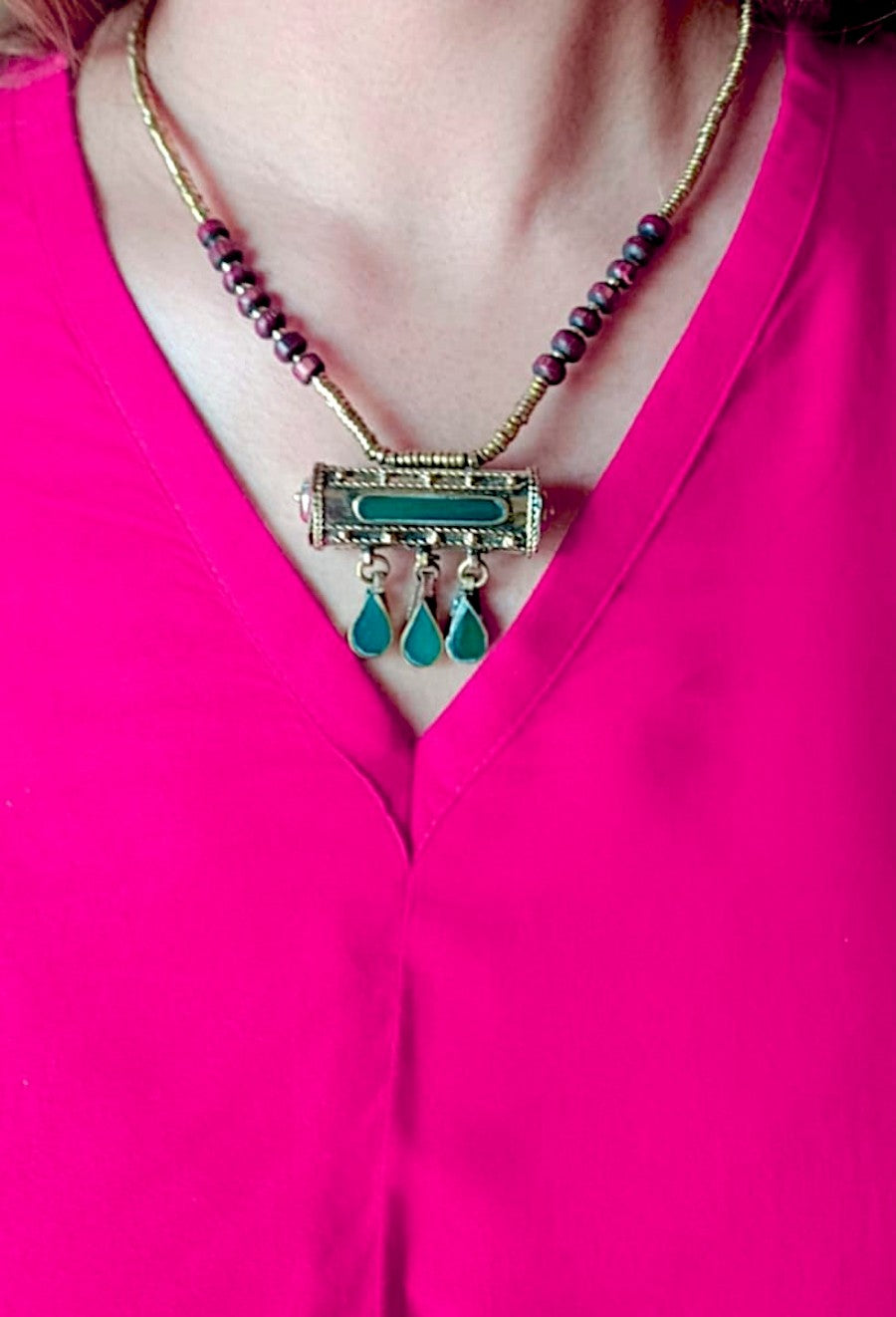 ✨ Design: Cylindrical amulet pendant with dangling teardrop charms