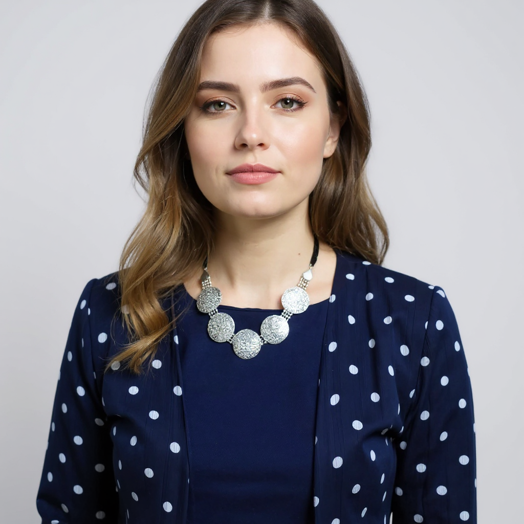 Vintage-inspired coin choker with antique silver finish and adjustable fit. A bold, timeless statement piece that blends bohemian charm with elegant sophistication.